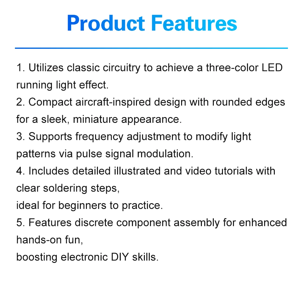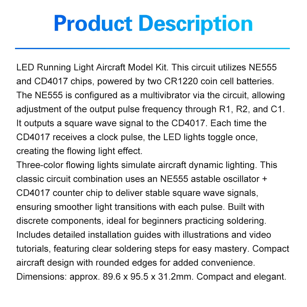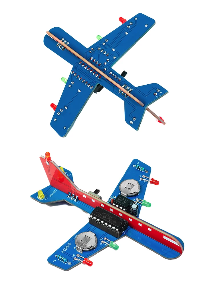 Three color flowing light, simulating dynamic lighting of aircraft, classic circuit combination, using NE555 multi harmonic oscillator+CD4017 counter chip, stable output square wave signal, each pulse makes light switching smoother. Adopting discrete components, suitable for novice welding practice, equipped with detailed installation graphics and video tutorials, the welding steps are clear and easy for beginners to get started. The small aircraft has rounded edges and corners, which is more considerate. The body size is about 89.6 * 95.5 * 31.2mm, compact and exquisite.